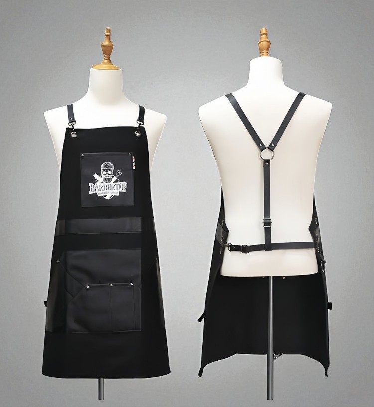專為專業美髮師設計的 黑色防水工作圍裙,採用耐磨布料與皮革拼接材質,防水、防髒、耐用。多功能收納口袋設計,