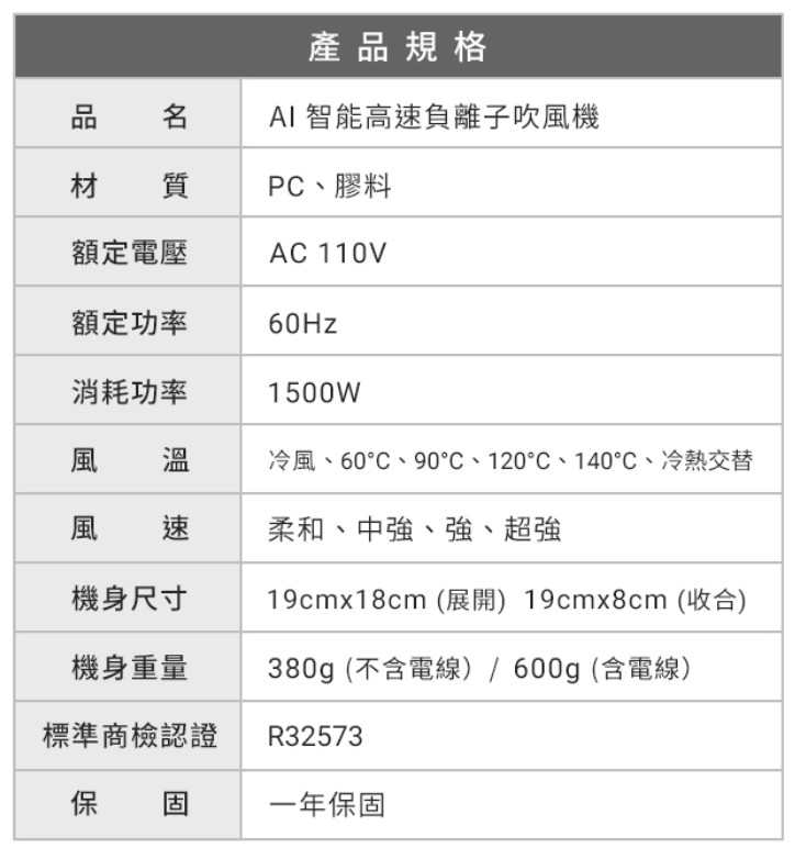 商品名稱 : AI智能高速負離子吹風機