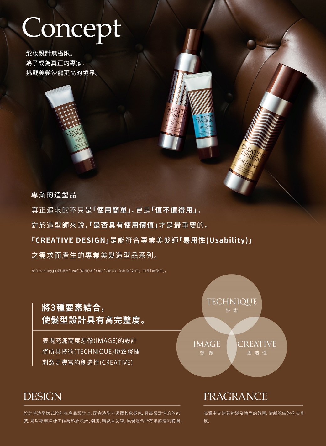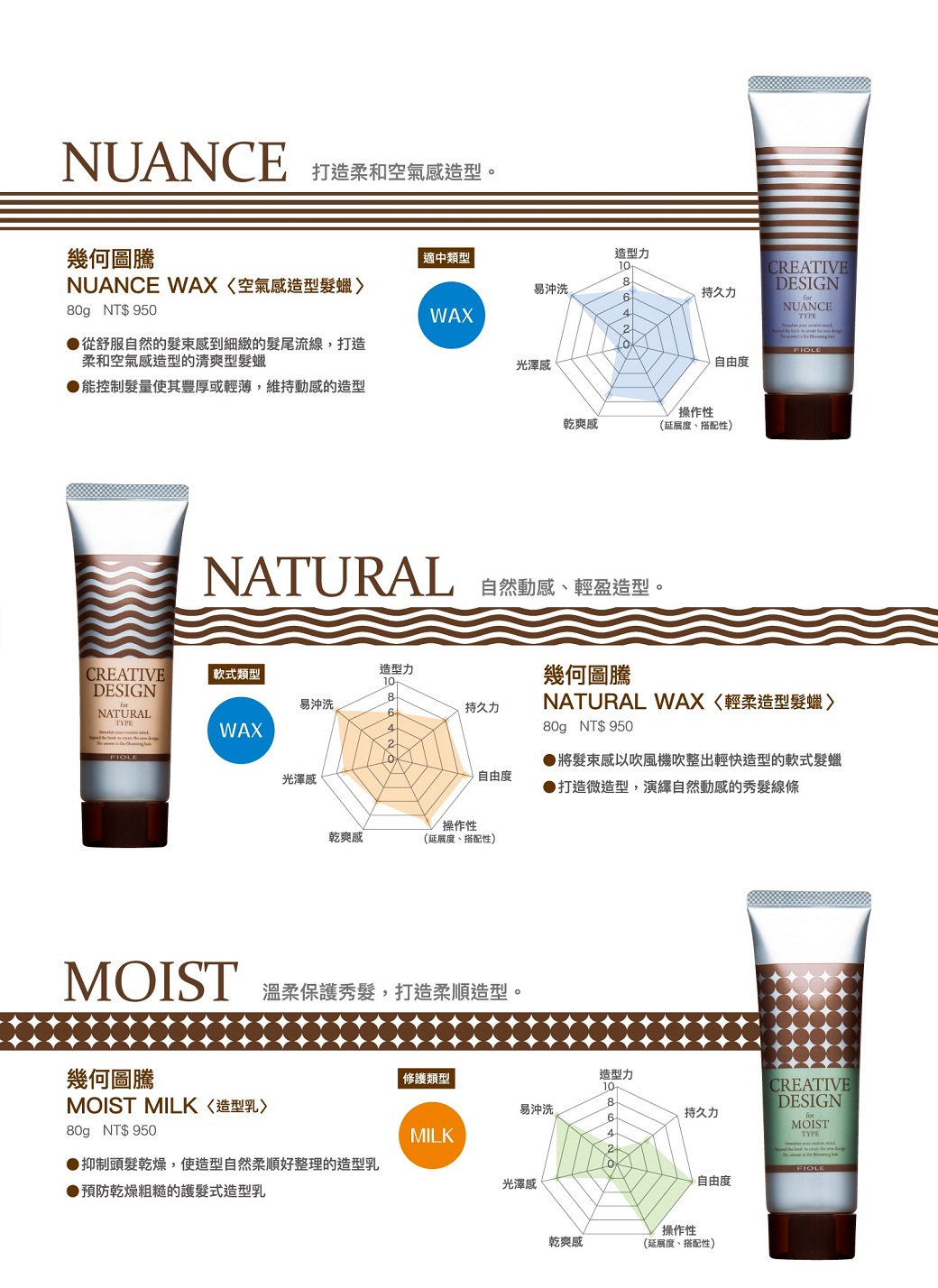 • 以吹風機吹整出輕盈造型的軟式髮蠟,呈現自然動感線條。
