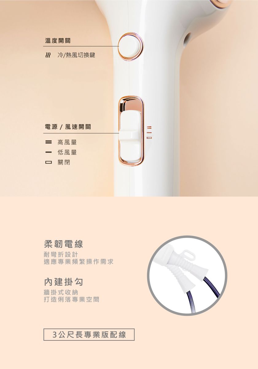 兩段(1-2)風速溫控:可自由調整冷風/熱風,精準控制造型。
