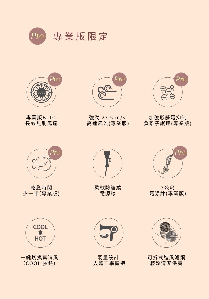 快速乾髮:大風壓技術,縮短吹髮時間 30%,適合美髮沙龍與居家使用。