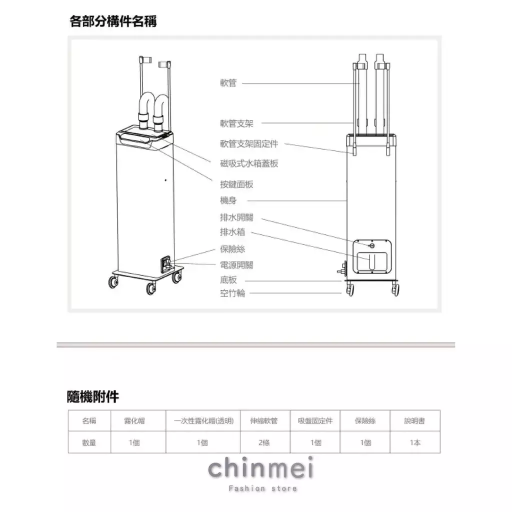 便利設計: 雙噴口設計 (可依需求接單管或雙管)、大容量水箱、機身背面設有快拆式排水閥與獨立電源開關。