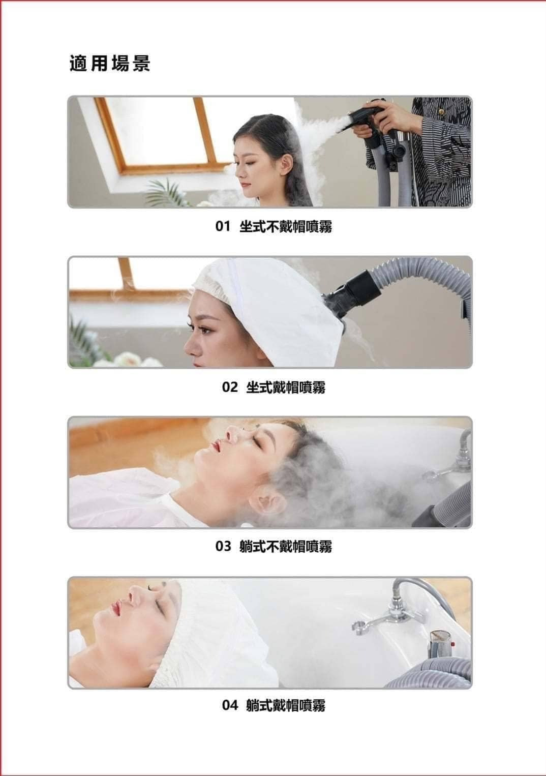 開始護髮: 待蒸氣穩定噴出後,將蒸氣管噴口對準顧客頭髮(配合蒸氣帽或直接噴灑),保持適當距離。