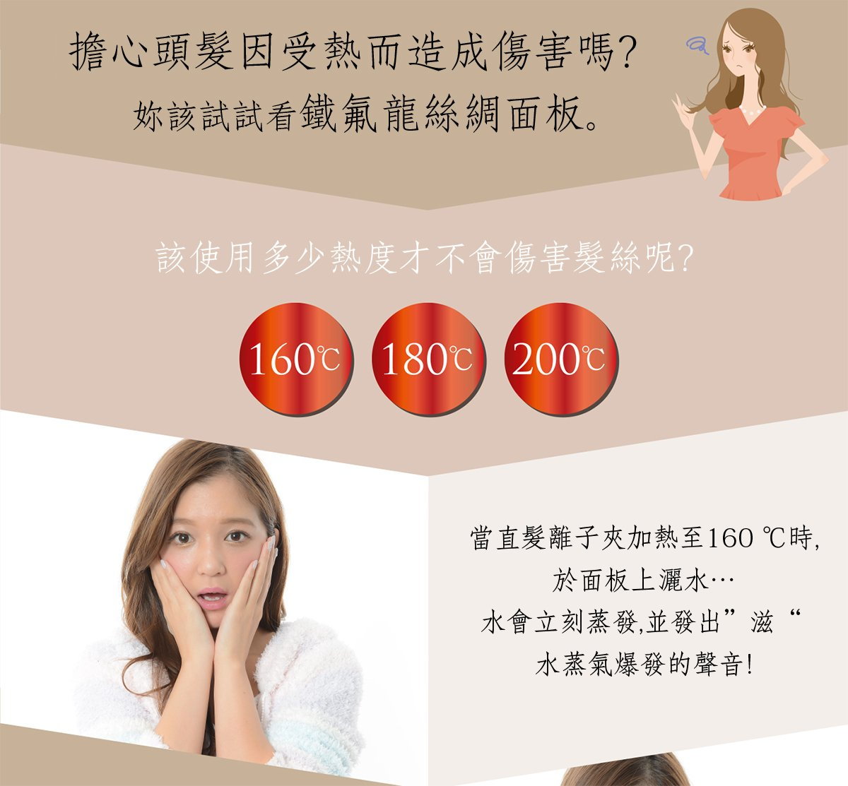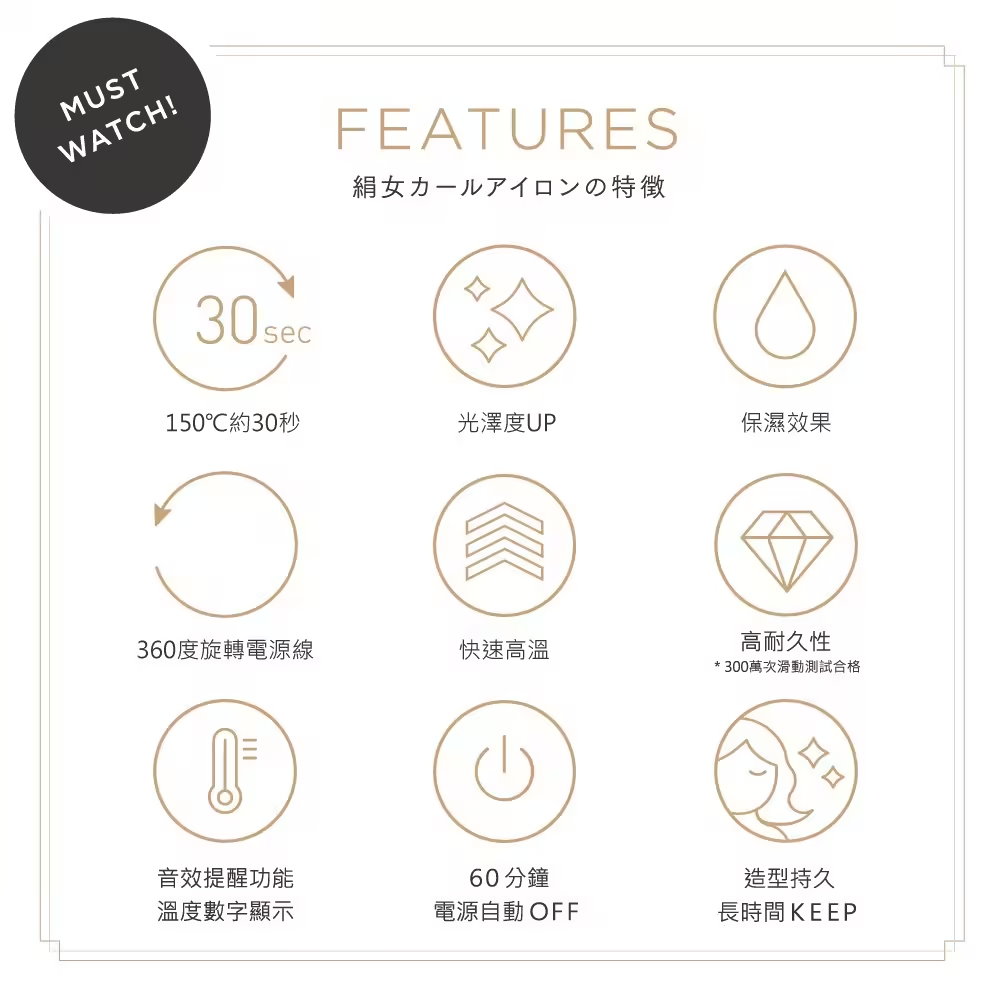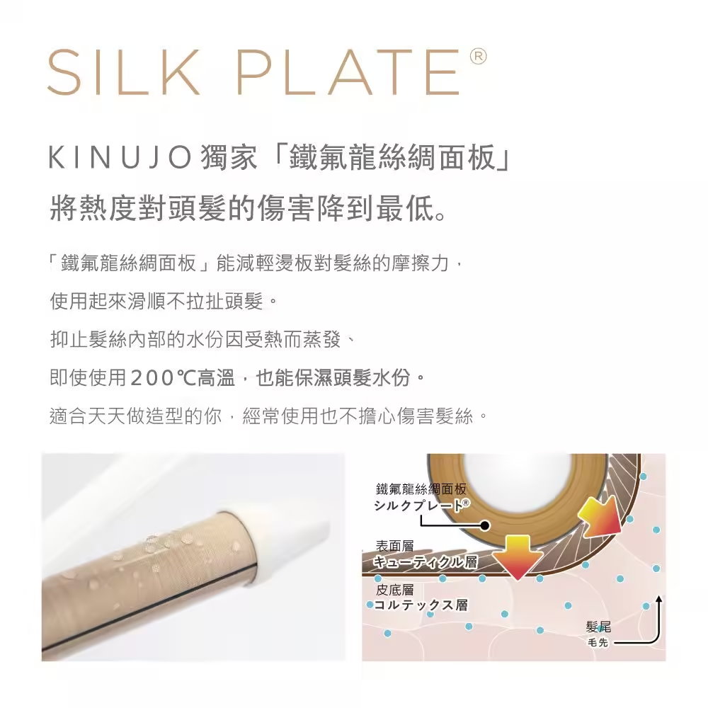 ★獨有專利「鐵氟龍絲綢面板」 即使在溫度高達200 ℃的燙板上撒水,水珠也不會蒸發!擁有超強保濕力、明顯提升頭髮光澤!