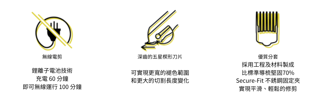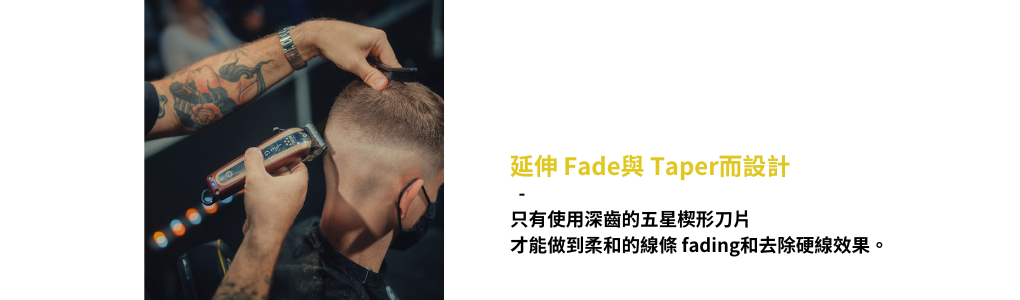 五星傳奇無線電剪是終極的 FADING 工具。 其獨特設計的刀片結構,配合深齒楔形刀片, 使得切割長度更廣,有助於打造無痕的漸層效果。