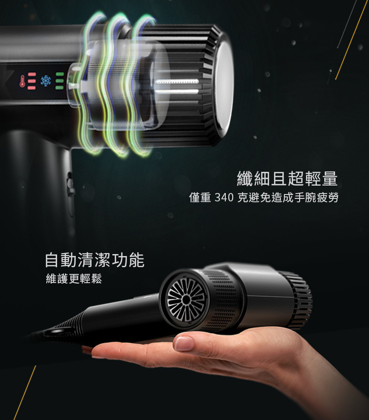 吹風機濾網若長期堆積灰塵,會影響風量與馬達壽命,Vanquish™ 內建自動清潔功能,確保濾網長時間維持潔淨,讓吹風機運行更順暢。