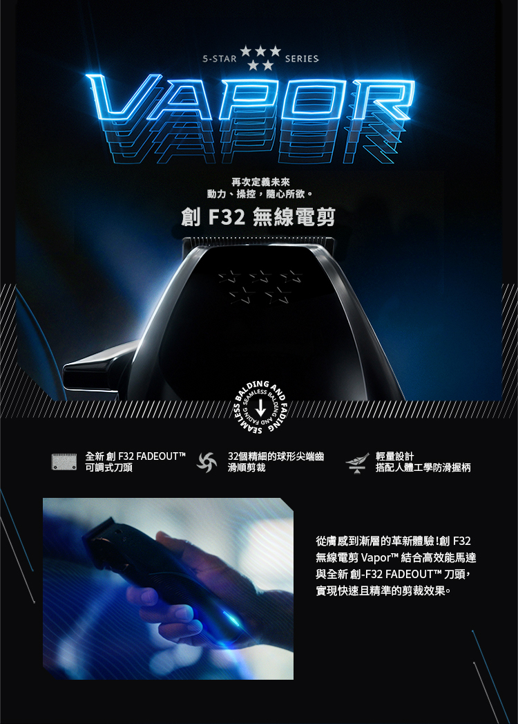 WAHL電剪、VAPOR F32、無線理髮器、專業推剪、理髮電推、WAHL專業電剪、可調刀頭電剪、WAHL VAPOR